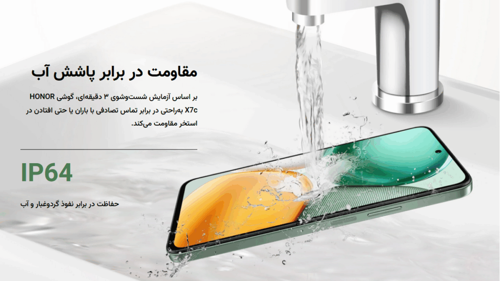بر اساس آزمایش شستوشوی ۳ دقیقهای، گوشی HONOR X7c بهراحتی در برابر تماس تصادفی با باران یا حتی افتادن در استخر مقاومت میکند.